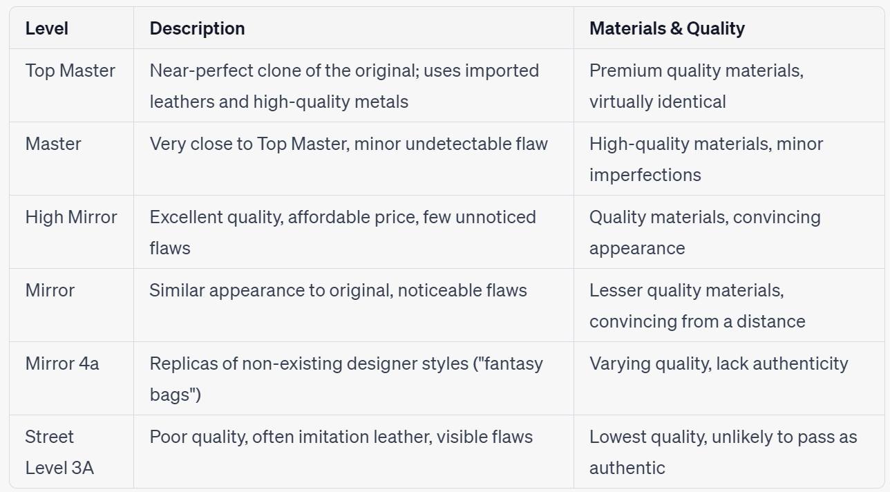 When it comes to designer replicas, there is a wide spectrum of quality and authenticity. These replicas can range from near-perfect clones to low-quality imitations. Here are the six levels of designer replicas, ranked from best to street level:
